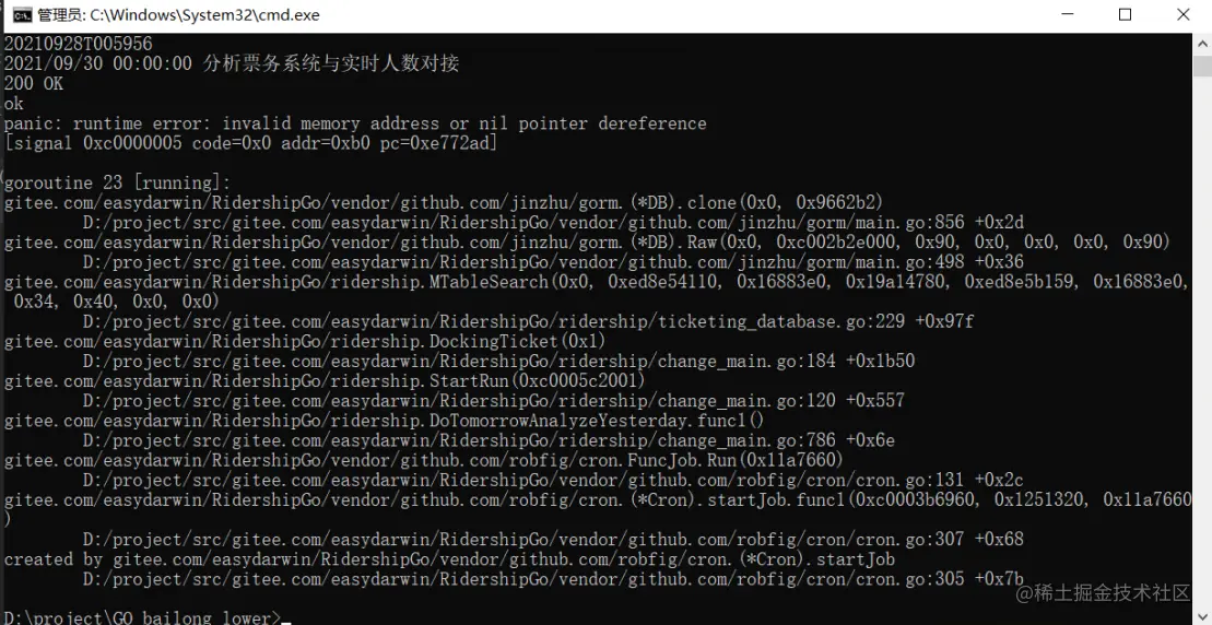 在景区测试时,该景区使用的是本地保存的数据库,且用的是微软的SQLServer数据库服务器,而其他景区使用的是mysql数据库,两边使用的数据库不一样,所以在测试的时候出现报错,错误日志:“panic: runtime error: invalid memory address or nil pointer derefernce [signal 0xc000005 code=0x0 addr=0xb0 pc=0xe773ad]”