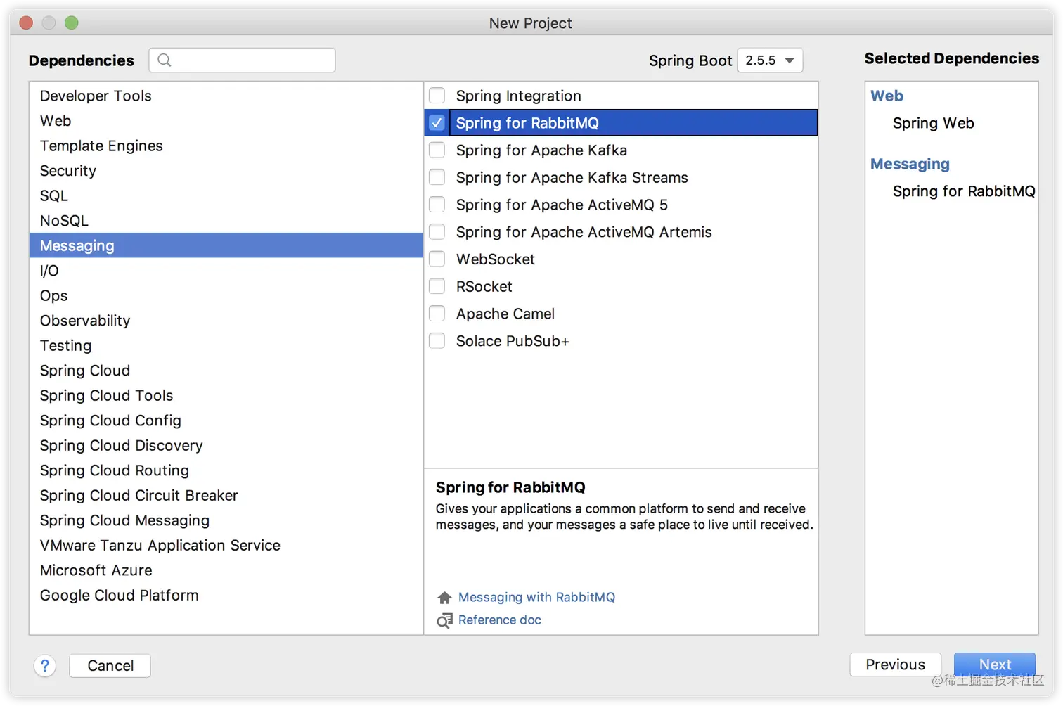 然后我们创建一个 Spring Boot 项目,引入 RabbitMQ 依赖: