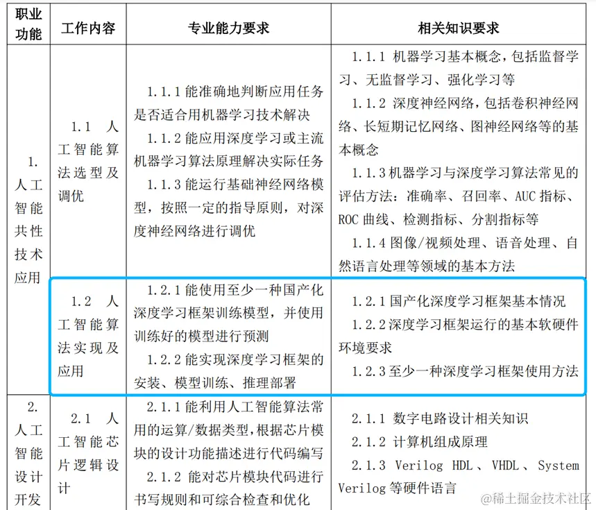 百度作为起草单位参与《人工智能工程技术人员国家职业技术技能标准》(以下简称“标准”)编写。人工智能工程技术人员(职业代码:2-02-10-09)是人社部2019年发布的高新技术领域新职业,是指从事与人工智能相关算法、深度学习等多种技术的分析、研究、开发,并对人工智能系统进行设计、优化、运维、管理和应用的工程技术人员。本标准对人工智能工程技术从业人员的专业活动内容进行规范,明确了初中高各等级专业技术人员的工作领域、工作内容以及知识水平、专业能力和实践要求。