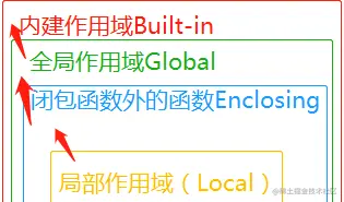 在局部找不到,便会去局部外的局部找(例如闭包),再找不到就会去全局找,再者去内置中找。