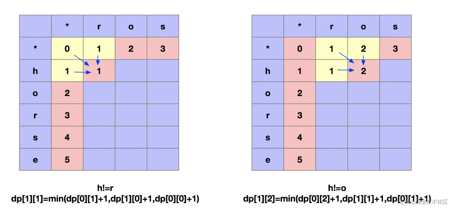 这样我们可以把原问题拆分成若干个子问题,我们假设A="horse",B="ros"。下面来看一下如何具体操作。