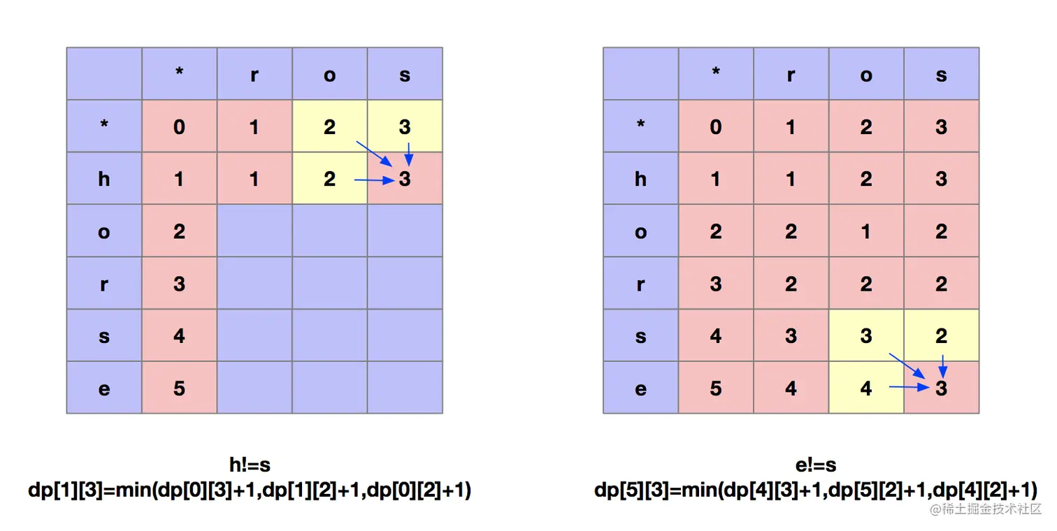 - 修改单词A中的一个字符:如果我们知道“hors”到“ro”的编辑距离为c,那么“horse”到 “ros”的编辑距离不会超过 c + 1。因为我们只需要把“horse”的最后一个字符e修改为s即可。