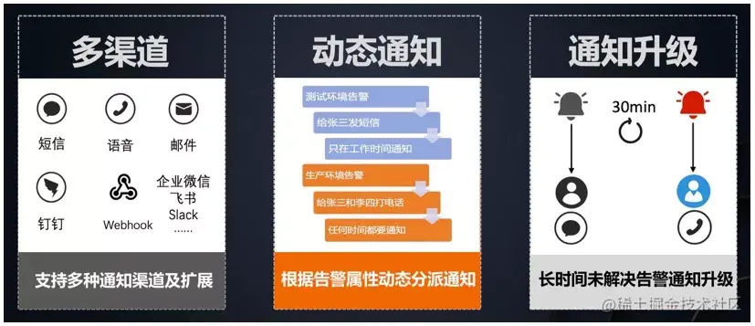 - 动态通知:可以根据告警属性动态分派通知。例如:测试环境的告警,通过短信通知到张三,并且只在工作时间通知;而生产环境的告警,通过电话通知到张三和李四,并且无论何时,都要进行通知。
