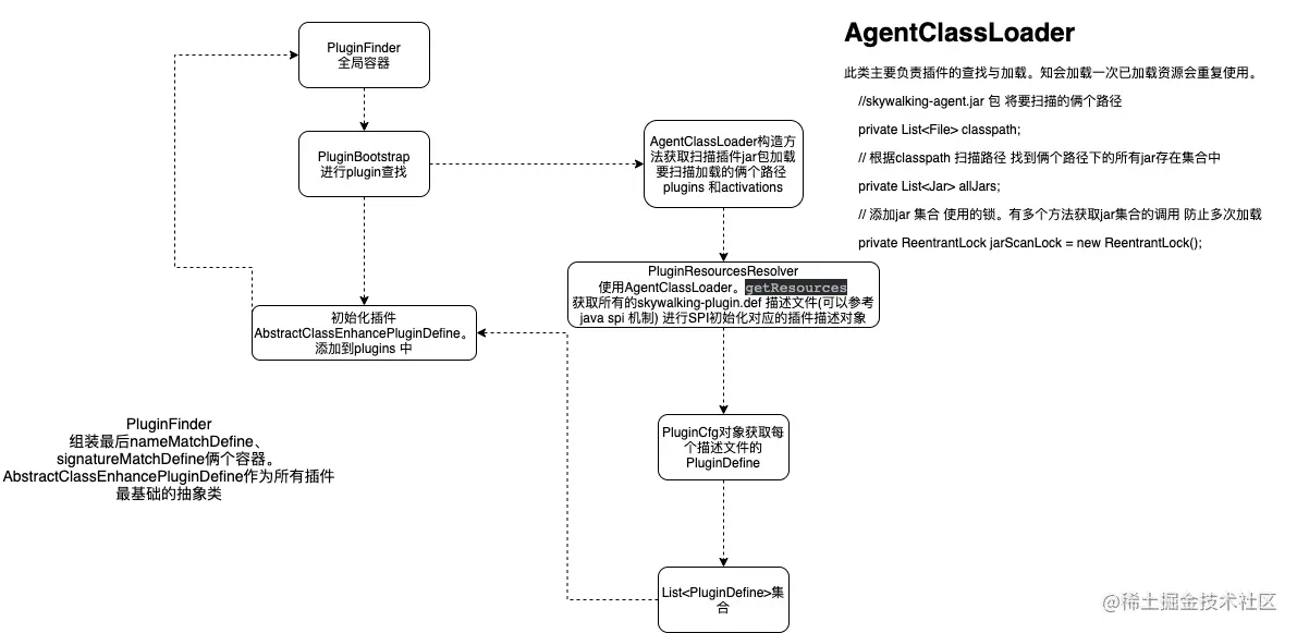// 加载所有的资源、将skywalking-plugin.def资源文件内的所有类进行初始化成PluginDefine描述对象, 并统一添加到pluginClassList 集合中