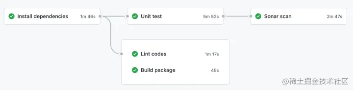 代码质量(Sonar scan) 使用 Sonar 来检测代码质量,并且用来展示单元测试报告。 GitHub Actions 中的 job: