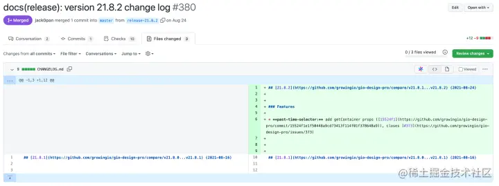 当这个 Pull Request 被合并后,就会触发持续交付流程,这也是有以下判断条件的原因: if: ${{ startsWith(github.event.head_commit.message, 'docs(release)') }} 当 job 执行完后,会在 GitHub 上创建对应的 release: