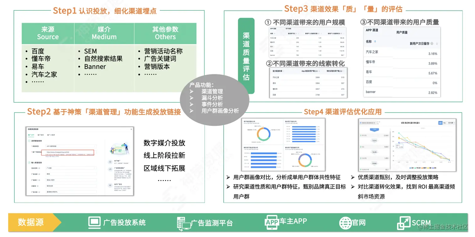 吉利汽车在后续垂直类媒体或主流渠道进行广告投放或拉新活动时,可以通过神策数据细化各渠道埋点实现快速洞察,并基于渠道管理功能生成不同的投放链接,将各渠道的投放数据与后续用户行为数据进行有效关联和打通,对不同渠道的转化效果进行实时分析和效果追踪。