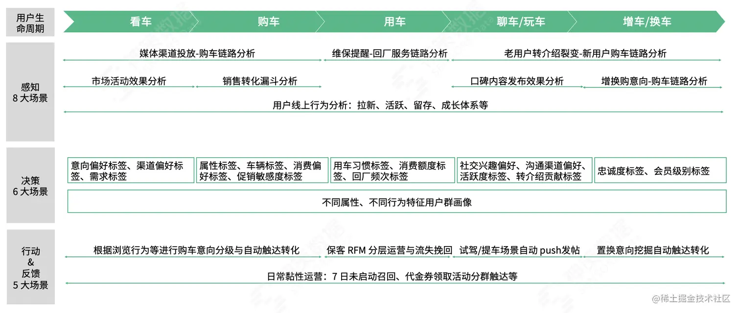数据互通后利用 ID-Mapping 的方法,完成用户线上线下行为的唯一识别,实现用户看车、购车、用车、聊车、玩车、换车全生命周期覆盖,以持续的运营行动赋能用户增长、销售转化与忠诚建立,释放更大的车主用户的全生命周期价值。