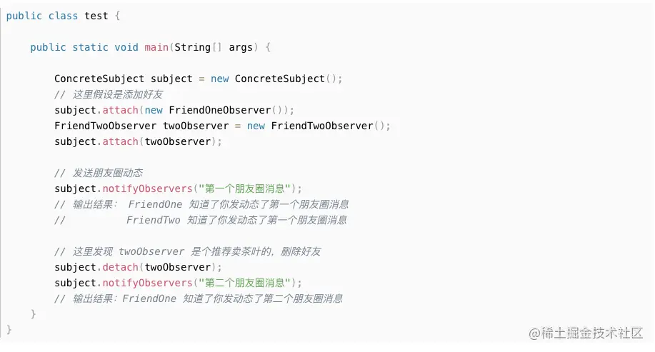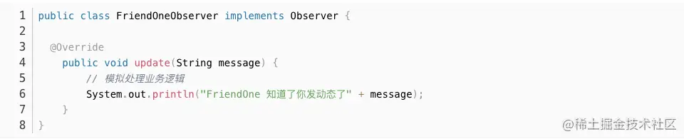 你就是subject,你的好友就是observer。你发了朋友圈(notify),你的好友们都可以看见,并且他们进行点赞和评论操作(update)。
