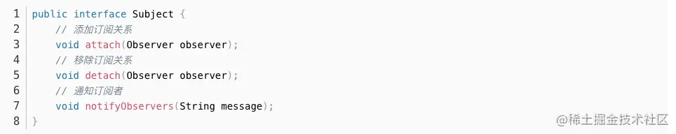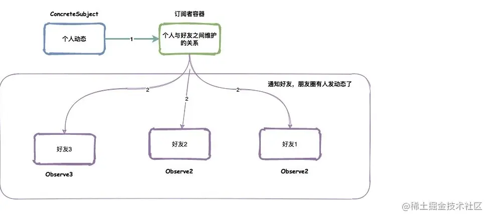 可以看到,通过concreteSubject(发朋友圈的人)维护了订阅关系,在通过notifyObserver方法通知订阅者(发朋友圈)之后,观察者都获取到信息,并进行相应的处理(看到点赞或评论。)