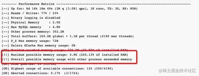 1)重要关注[!!](中括号有叹号的项)例如[!!] Maximum possible memory usage: 4.8G (244.13% of installed RAM),表示内存已经严重用超了。