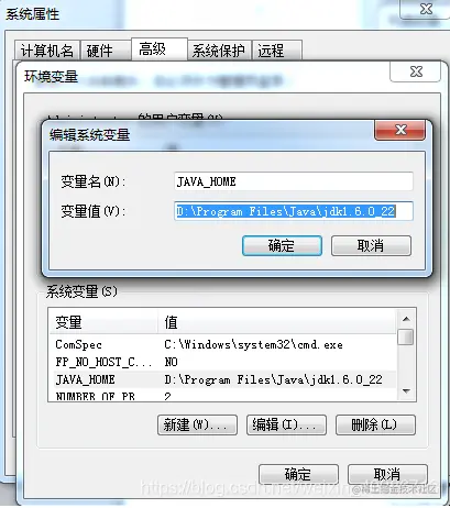 2.点击”新建”按钮,在变量名中输入”JAVA_HOME”(不包含引号),变量值为你的操作系统中JDK的安装路径,我的JDK安装路径为:D:\Program Files\Java\jdk1.6.0_22,然后点击”确定”按钮