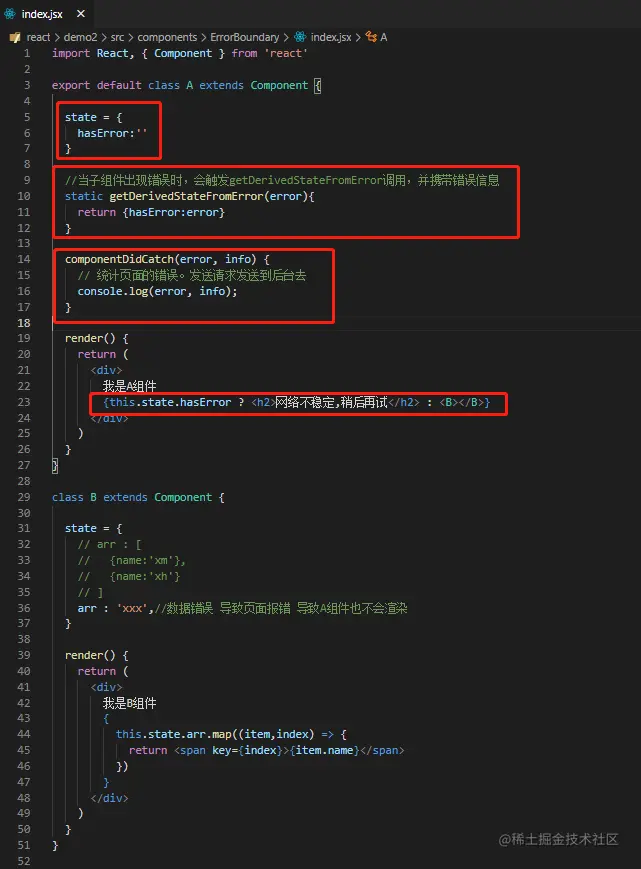 只能捕获后代组件生命周期产生的错误,不能捕获自己组件产生的错误和其他组件在合成事件、定时器中产生的错误