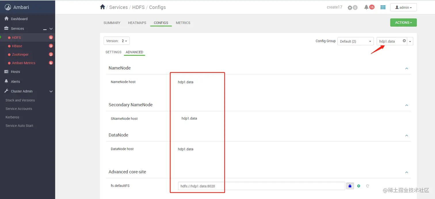 在启动所有服务的时候,发现 hbase 启动的时候报了错,报与 hdfs 交互时,无法访问 server.data 主机名,就很奇怪。通过ambari 界面,去 hdfs 服务的配置里面搜了一下,发现配置又被更改了,如下图所示: