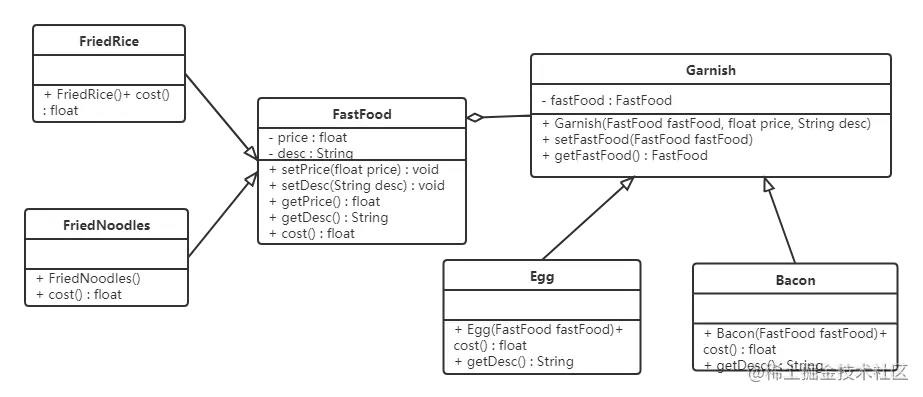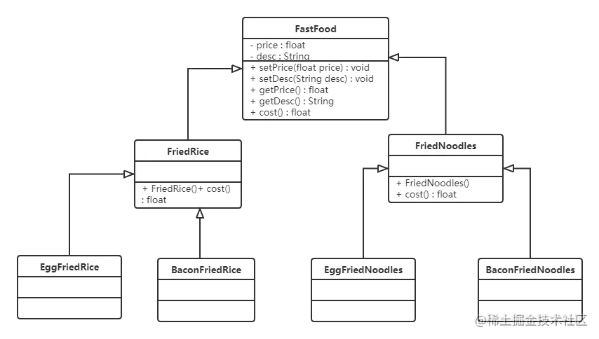 如果要再加一种配料(火腿肠),我们就会发现需要给FriedRice和FriedNoodles分别定义一个子类。如果要新增一个快餐品类(炒河粉)的话,就需要定义更多的子类。