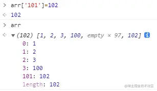 我们想像添加非整型数值字符串一样把'101'当成数组的自有属性存储,结果整型字符串'101'却被强行转换成整型数字,当作数组元素存放了。