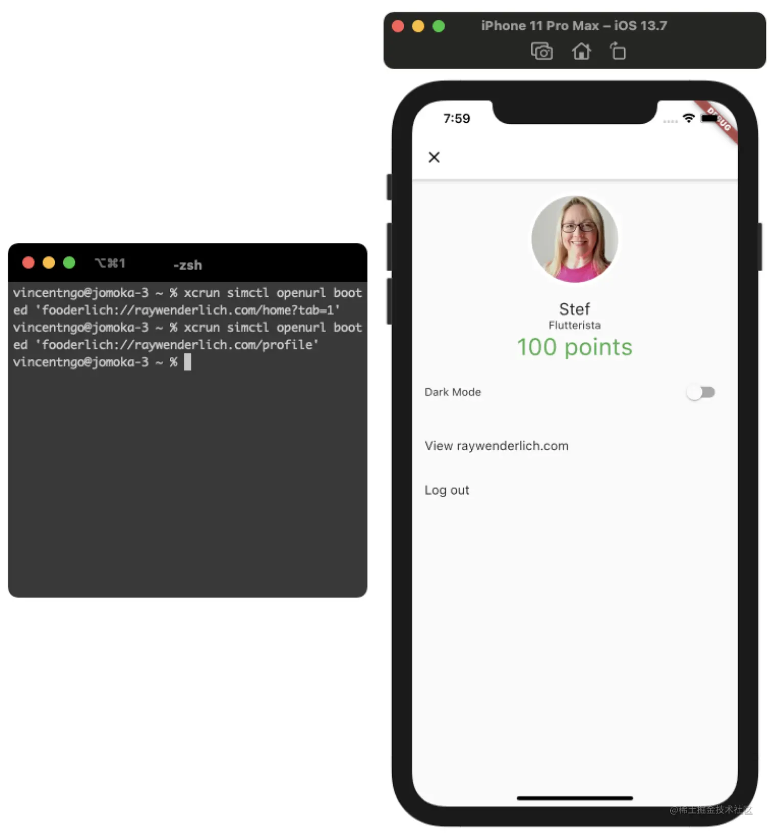 xcrun simctl openurl booted 'fooderlich://raywenderlich.com/profile' 。