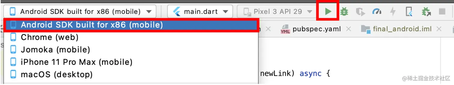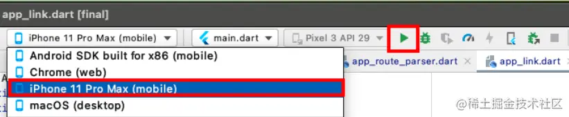 在Android Studio中,选择一个iOS设备并按下播放按钮。