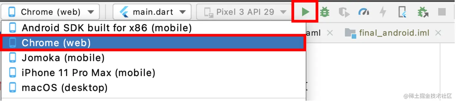 停止在Android上运行。在Android Studio中,选择Chrome (web)并点击Play按钮。