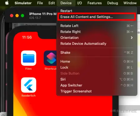 - 如果你在iOS模拟器上运行,你可以选择**擦除所有内容和设置...**来清除缓存。