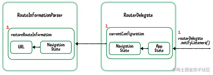 notifyListeners()就会启动。 RouteInformationParser要求提供当前的导航配置,所以你必须将你的应用状态转换为AppLink。RouteInformationParser然后调用restoreRouteInformation并将AppLink转换为一个URL字符串。