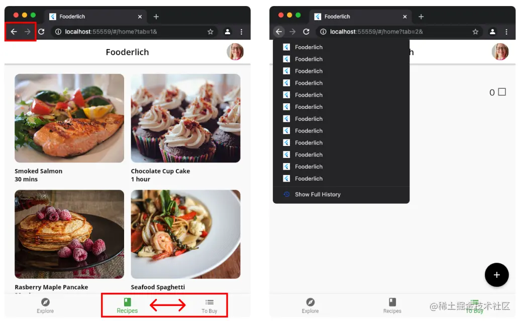 点击返回和前进按钮,该应用程序将恢复该状态! 这有多酷啊?你可以做的另一件事是长按返回按钮,跳到浏览器历史中的一个特定状态。