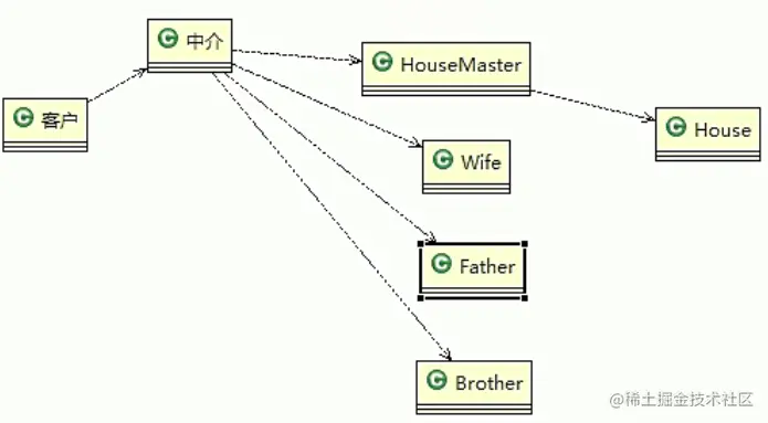 这就是我们中介模式的简单体现,我们当要去租一个房子的时候如我们直接和房子的主人去联系,那我们还要和他的家人去交流,但是有这个中间之后,我们只需要去和中介对接,具体租房交谈的过程是我们中介去沟通。