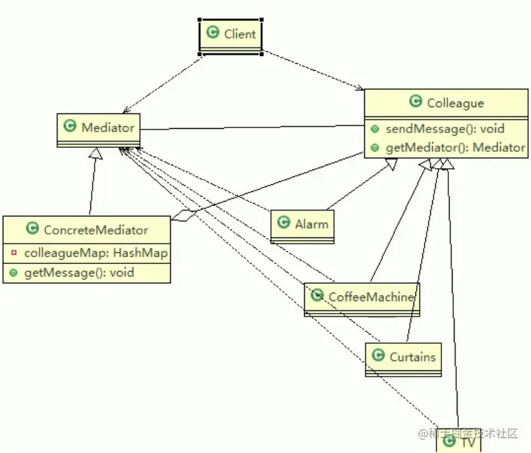 - ConcreteMediator具体的中介者对象,实现抽象方法,他需要知道所有的具体的同事类,即以一个集合来管理HashMap,并接受某个同事对象消息,完成相应的任务