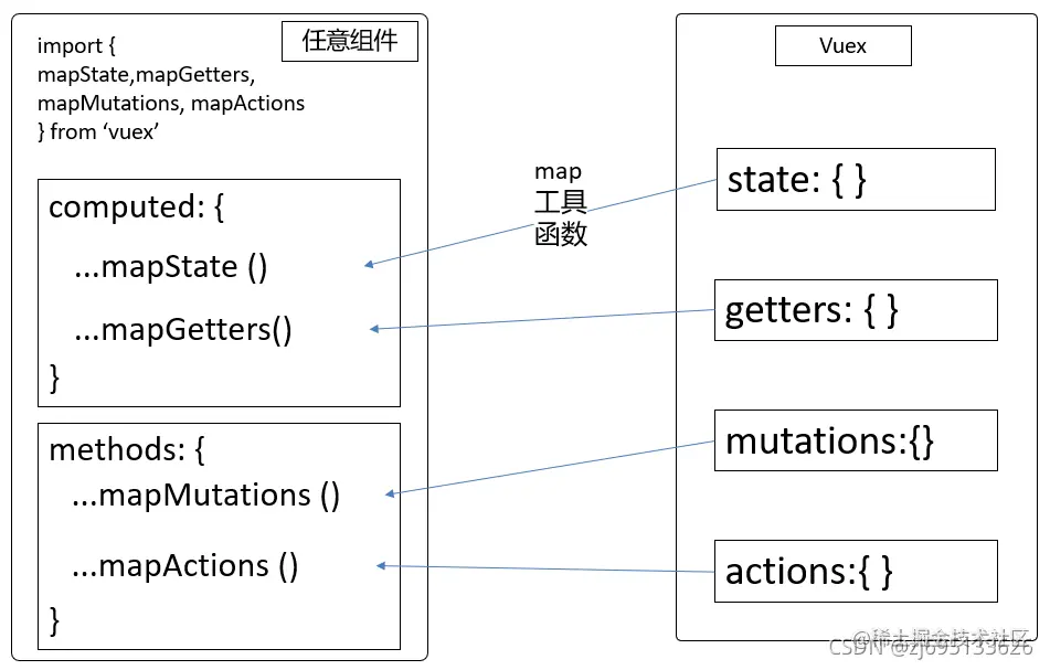 用来优化访问的方式, 普通的写法太麻烦了,利用vuex内置的方法,可以简洁的引用vuex中的数据和方法