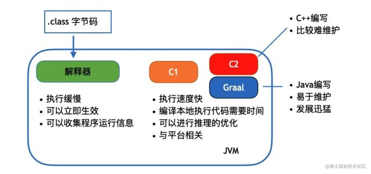 GraalVM:JVM为了提升效率,借助JIT及时编译技术对解释执行的字节码进行局部优化,通过编译器生成本地执行代码提升应用执行效率。