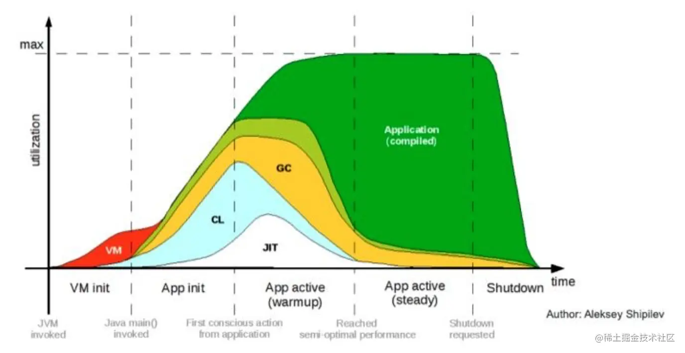 - 从JVM启动到真的应用程序执行需要经历VM加载,字节码文件加载,以及JVM为了提升效率,借助JIT(just in time)及时编译技术对解释执行的字节码进行局部优化,通过编译器生成本地执行代码的过程,同时还需要加上了JVM内部垃圾回收所耗费的时间。