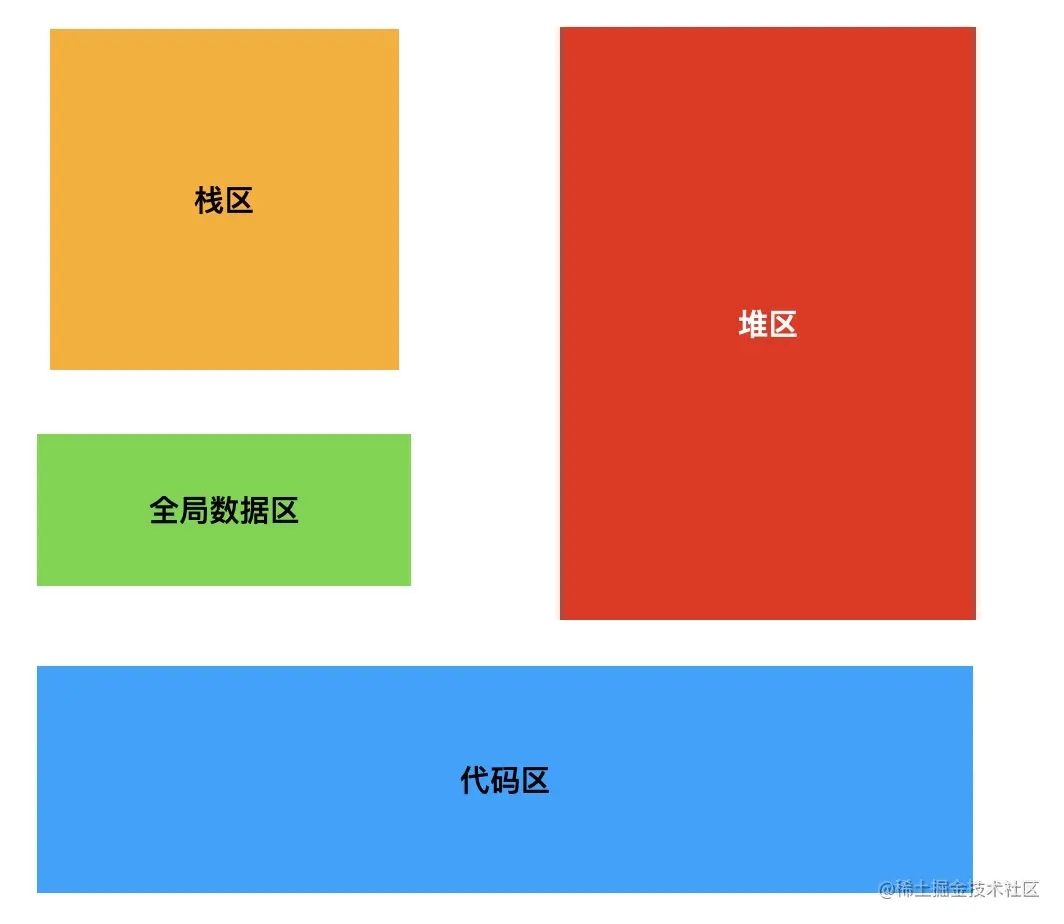 内存分为代码区、全局数据区、堆区、栈区等,这是操作系统可执行文件的内存模型,如果是 javascript、java 这种解释型语言,那还会再做自己的一些划分。但总体来说,都是分为这几部分。