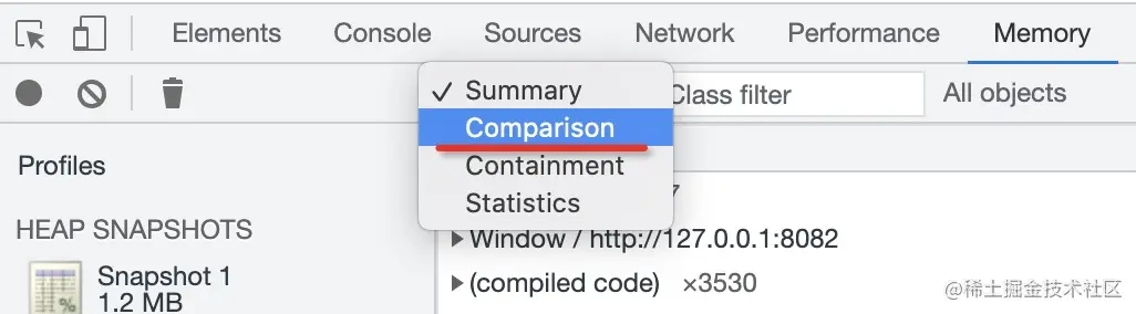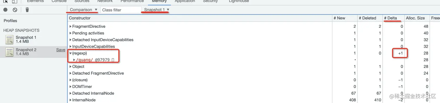 我们用 chrome devtools 的 memory 工具分别取两次快照。