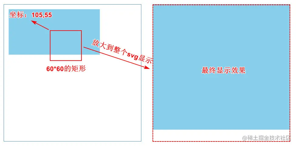 先分析一下原理,再来看效果,上面设置的viewbox的值为:105 55 60 60,每个参数的含义如下: