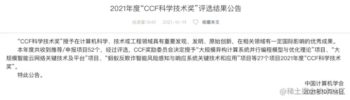 中国计算机学会(CCF)是中国计算机及相关领域的权威机构,为促进计算机科学与技术的创新和进步,CCF设立中国计算机学会奖(CCF奖),旨在鼓励在计算机科学、技术或工程领域具有重要发现、发明、原始创新,在相关领域有一定国际影响的优秀成果。
