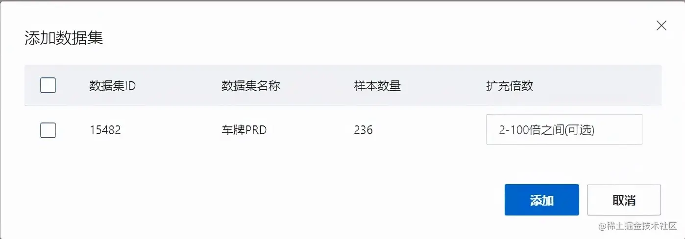 数据准备模块的数据配置文件由默认配置文件和平台交互信息融合获得。如图平台数据准备示意图所示,左侧添加数据集表示选择的数据集。右侧标签选择页面的勾选表示选择的类别。右侧标签选择页面的操作对应数据准备模块算子。当在平台上添加数据集时会跳转到下图所示页面,在此页面可以勾选需要加入训练的数据集。同时可以选择数据集扩充倍数。