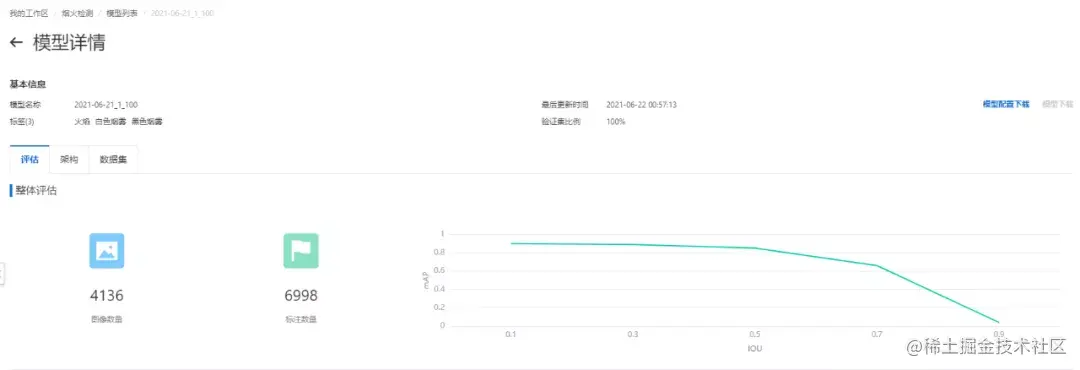 模型评估在工业视觉智能平台上分为整体评估结果、详细评估结果和检测结果展示。