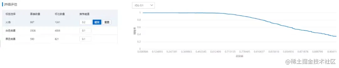 图25所示是模型评估的详细评估部分展示,左侧可以调节详细评估时不同类别的阈值,并且展示该类别的图像数量和标注数量。右侧是该类别在不同阈值下的召回率和精确度曲线。