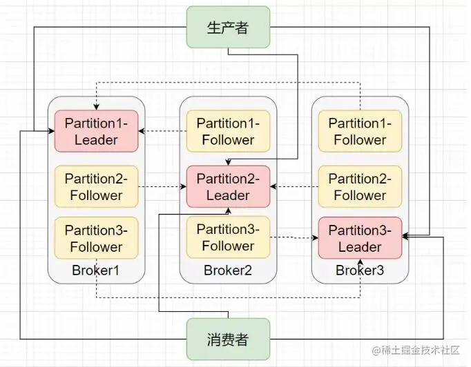每个 Partition 的副本都包括一个 Leader 副本和多个 Follower副本,Leader由所有的副本共同选举得出,其他副本则都为Follower副本。在生产者写或者消费者读的时候,都只会与Leader打交道,在写入数据后Follower就会来拉取数据进行数据同步。