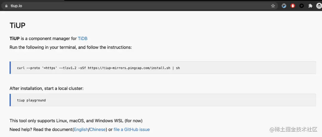 我经常教育我们年轻的产品经理: “你的用户充其量会在你的 GitHub 首页或者文档的 Quick Start 部分上停留 10 秒,甚至连看完这个文档的耐心都没有,他们的潜意识会寻找「深色背景的字」(shell 命令),然后把里面东西复制到自己的终端里看会发生什么,除此之外啥都不会做,如果这第一条命令失败了,不会再有后面什么事了,所以记住你只有一次机会”。 一个小例子就是当时在做 TiUP(TiDB 的安装部署工具)的时候,我反复告诫 TiUP 的产品经理,首页里不要废话,就一句命令,贴进去就能用: