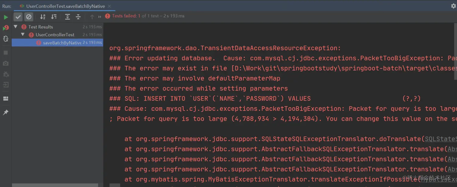 这是因为使用 MyBatis 原生批量插入拼接的插入 SQL 大小是 4.56M,而默认情况下 MySQL 可以执行的最大 SQL 为 4M,那么在程序执行时就会报错了。