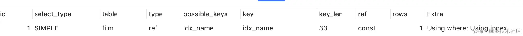 | 1 | SIMPLE | film | index | PRIMARY | idx_name | 33 | NULL | 3 | Using where; Using index |