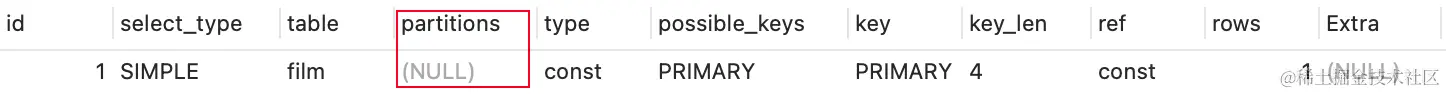 2)explain partitions:相比 explain 多了个 partitions 字段,如果查询是基于分区表的话,会显示查询将访问的分区。