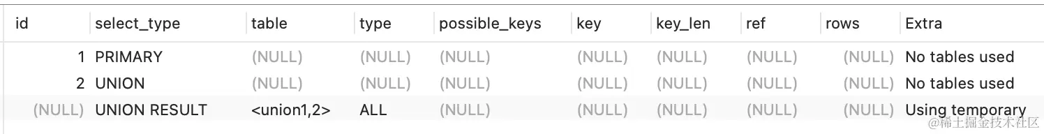 union结果总是放在一个匿名临时表中,临时表不在SQL总出现,因此它的id是NULL。