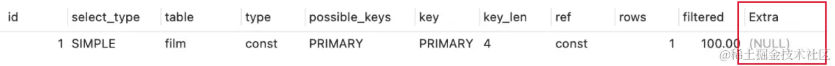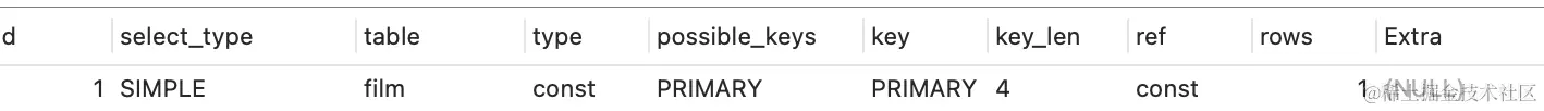 | 1 | SIMPLE | film | index | NULL | PRIMARY | 4 | NULL | 3 | Using index |