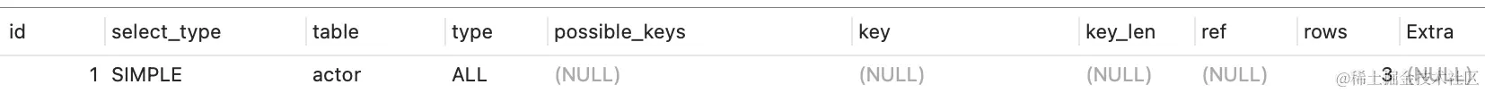 | 1 | SIMPLE | actor | ALL | NULL | NULL | NULL | NULL | 2 | Using filesort |