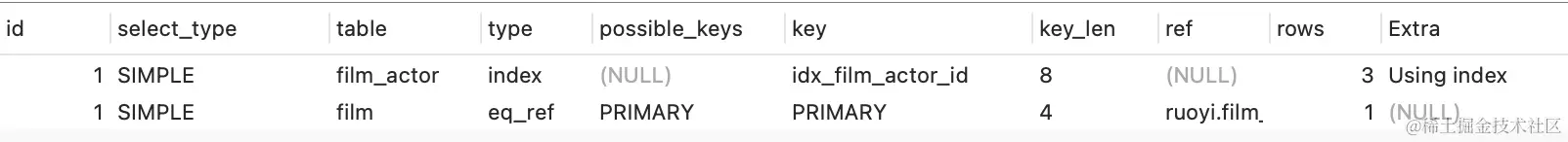 2.关联表查询,idx_film_actor_id是film_id和actor_id的联合索引,这里使用到了film_actor的左边前缀film_id部分。