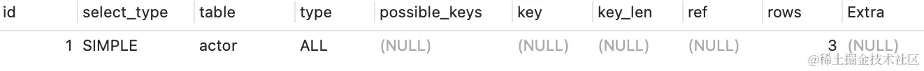 | id | select_type | table | type | possible_keys | key | key_len | ref | rows | Extra