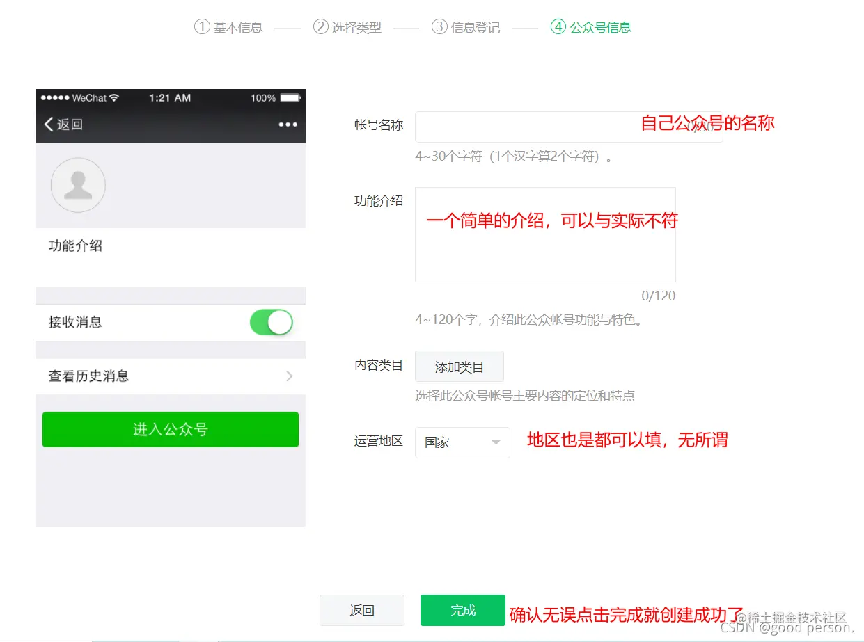 如何创建公众号,5分钟申请公众号详细步骤 前端老实人 2021-10-18 419 阅读1分钟 第一步 直达链接: 点击直达 会进到这个页面: 这个邮箱注册的,跟你微信以前注册的不冲突的; 按步骤填完即可 第二步 选类型,选第一个即可,比较适用于个人 第三步 出现成功就ok了 注意:创建成功后有个审核期,最晚7天就可以搜索到自己的公众号了 这是我的,不信的可以去看看哦!嘻嘻,学到了吗 最后 如果对您有帮助,希望能给个👍评论收藏三连! 博主为人老实,无偿解答问题哦❤