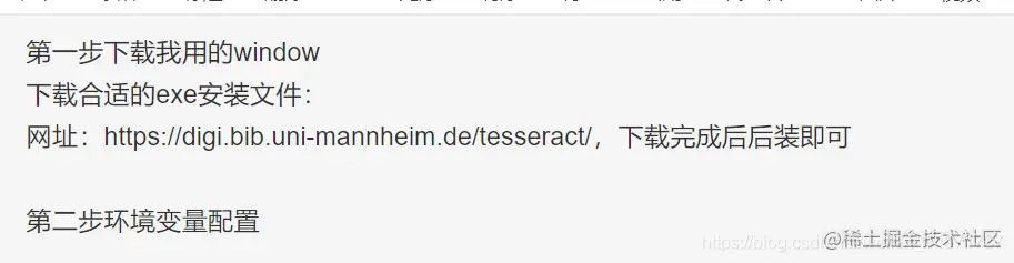 下载leptonica 和 tesseract两个包,解压安装,配置环境变量即可。网上很容易找到该安装包。